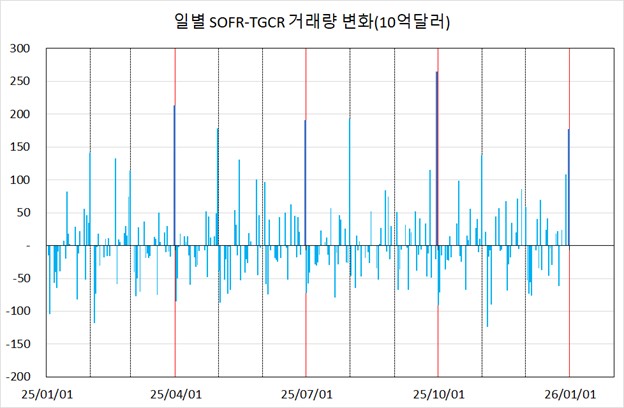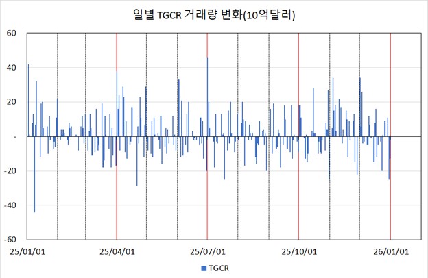 분기말과 연말의 거래량 변화를 보면 유럽계 은행의 대차대조표 축소에 따라 TGCR 시장에서 거래량이 확실히 줄어들고 있는 것을 확인할 수 있습니다.