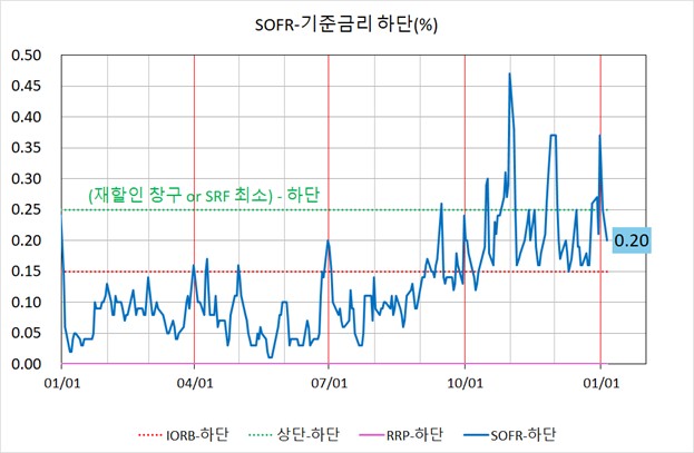 그림에서 빨간 수직선은 분기말을 의미합니다. SOFR 금리의 흐름(파란색 선)을 보면, 실시간 거시경제 이슈와는 관계 없이 빨간 수직선(매 분기말)을 만날 때마다 금리가 확실히 위로 솟구치는 경향을 보인다는 것을 확인할 수 있습니다. 특히 9월 이후 SOFR-하단은 IORB-하단을 넘어섰고 급기야는 재할인 창구-하단 또는 SRF-하단을 종종 상회하는 모습을 보였습니다.