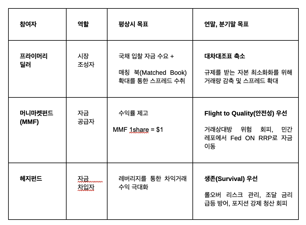 이러한 흐름이 의미하는 것은 간단합니다. 레포 시장 생태계 내에서 각 참여자는 서로 다른 목적을 가지고 움직이며, 이는 특히 분기말과 연말에 서로의 이해 상충이 최고조에 달하는 형태로 발현된다는 것입니다.