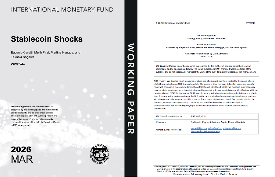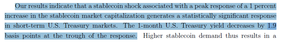 연준 연구노트는 결제용 스테이블코인 준비자산으로 단기 미 국채가 핵심이 될 수 있다고 설명한다. IMF 논문에서도 USDC와 USDT 시가총액이 1% 늘어나는 충격이 1개월 T-bill 금리를 약 1.9bp 낮춘다고 추정했다.