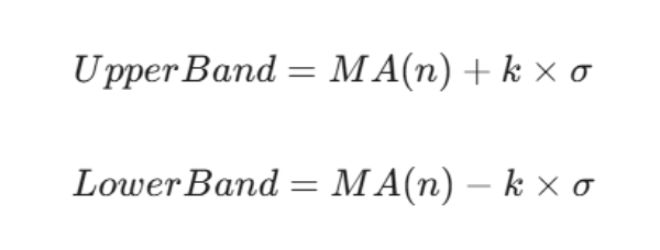 볼린저 밴드의 공식은 표준편차(σ)를 활용합니다.